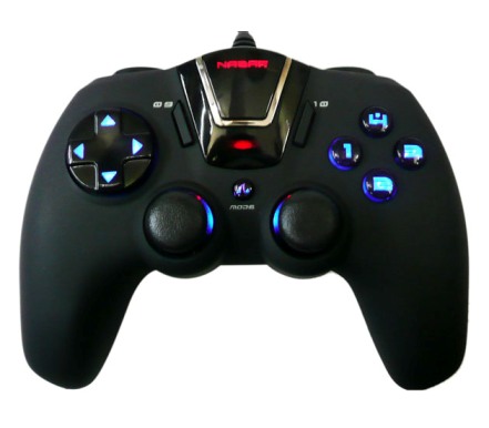 - Nazar V61: V61 được thiết kế kỹ càng đến từng chi tiết,bao bì được phối hợp giữa công nghệ in cán nilon và công nghệ tráng phủ UV làm cho V61 trở lên sang trọng hơn bất cứ loại gamepad nào khác. Các phím L2, R2 to bản, khít nên khắc phục nhược điểm “xộc xệch” của tay cầm Sony PS2. Đáng chú ý nhất là V61 được trang bị đèn LED màu xanh rất đẹp và sang trọng. Hơn thế phím bấm cao su được test trên 5 triệu lần bấm nên độ bền của gamepad này càng được đảm bảo