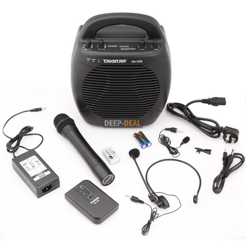 Máy trợ giảng Takstar DA-1232 thiết kế hiện đại, gọn nhẹ có thể xách tay, âm thanh rõ ràng, trung thực. Phạm vi đáp tuyến tần số rộng, tiêu thụ điện năng thấp. Phù hợp với việc sử dụng trong giảng đường, lớp học và ngoài trời. Trọn bộ sản phẩm bao gồm 1 loa trợ giảng công suất lớn xách tay với trọng lượng khoảng 2,5kg, 01 micro không dây cầm tay, 01 micro gài tai, 01 micro cài áo, bộ phát sóng không dây, adaptor sạc pin cho loa trợ giảng, pin micro cầm tay, dây nối loa với máy tính PC.