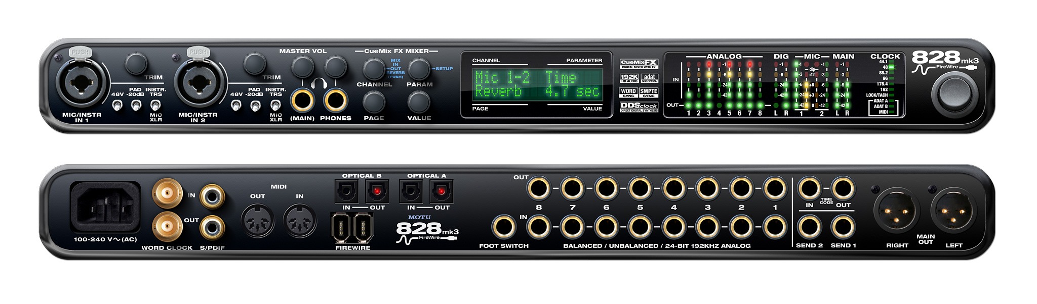 MOTU 828 Mk3 được trang bị một phần cứng cao cấp sản xuất bởi các chuyên gia âm thanh hàng đầu tại Mỹ để đáp ứng cho các nhu cầu thu âm chuyên nghiệp và sân khấu, có hoặc không có một máy tính. Là một giao diện âm thanh hoặc máy trộn độc lập, 828mk3 cung cấp 28 đầu vào riêng biệt và 30 đầu ra riêng biệt, 2 headphone phía trước. Trộn và xử lý các hiệu ứng âm thanh mạnh mẽ bởi các thành phần đã được cung cấp sẵn bên trong. Kết nối tất cả các thiết bị studio của bạn, bao gồm cả micro, guitar, synths, bàn phím, trống máy và thậm chí cả bộ xử lý hiệu ứng. Ghi âm, thiết lập và hiển thị tất cả các quá trình của các đầu vào trực tiếp trên mixer ảo kỹ thuật số CueMix - không có độ trễ và không làm ảnh hưởng tới vi xử lý trên máy tính của bạn. Áp dụng phần cứng DSP-driven nén, reverb, EQ thông minh và bảo vệ quá tải cho mỗi đầu vào/ đầu ra độc lập.