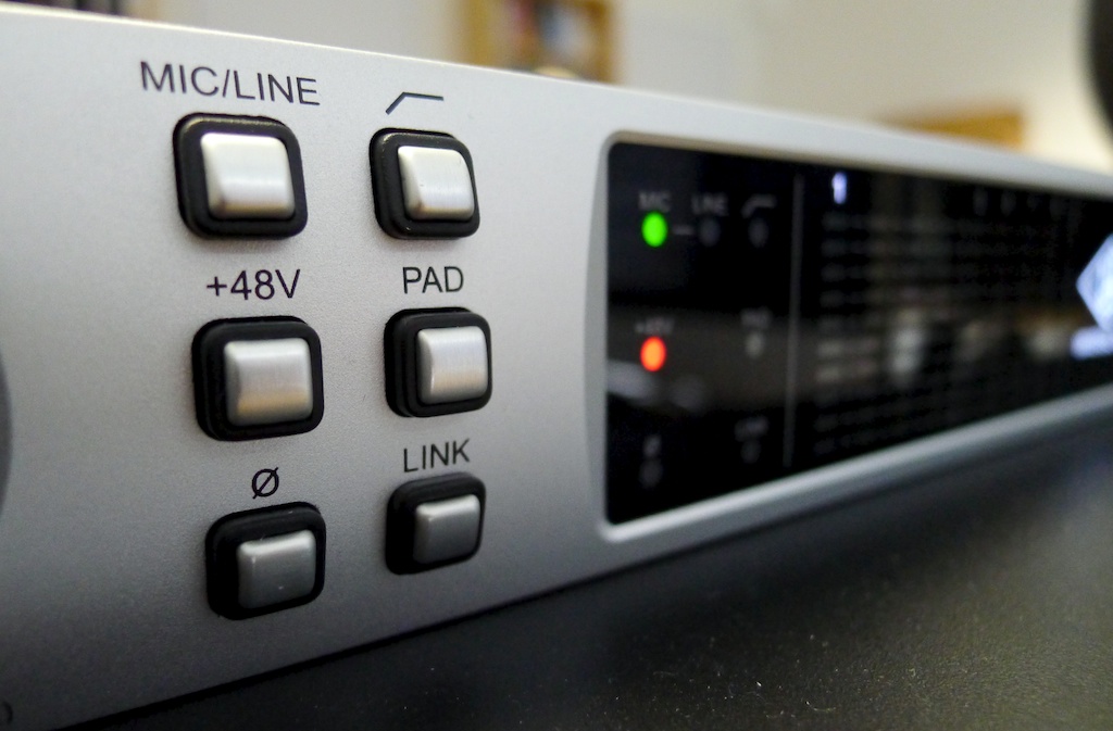 - 4 ngõ vào cho micro tích hợp tiền khuếch đại Preamp chất lượng cao, phân dải cao và cực kỳ trong trẻo. Các preamp được điều khiển số hóa bằng volume hoặc bằng trình điều khiển trên máy tính. Ngoài ra, các ngõ vào micro còn được tích hợp chức năng Lowcut, Phantom 48V, Pad 20dB, đảo pha và Stereo link.