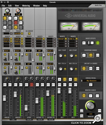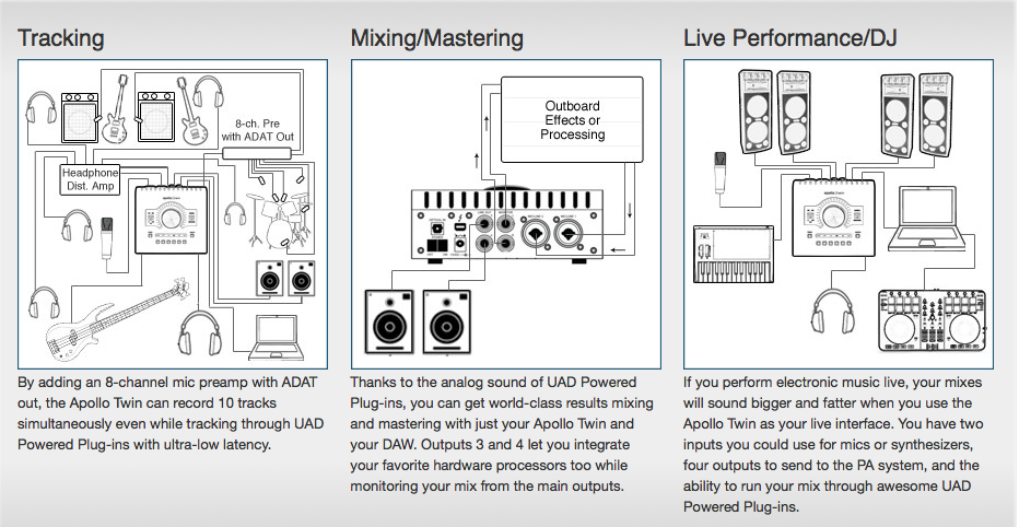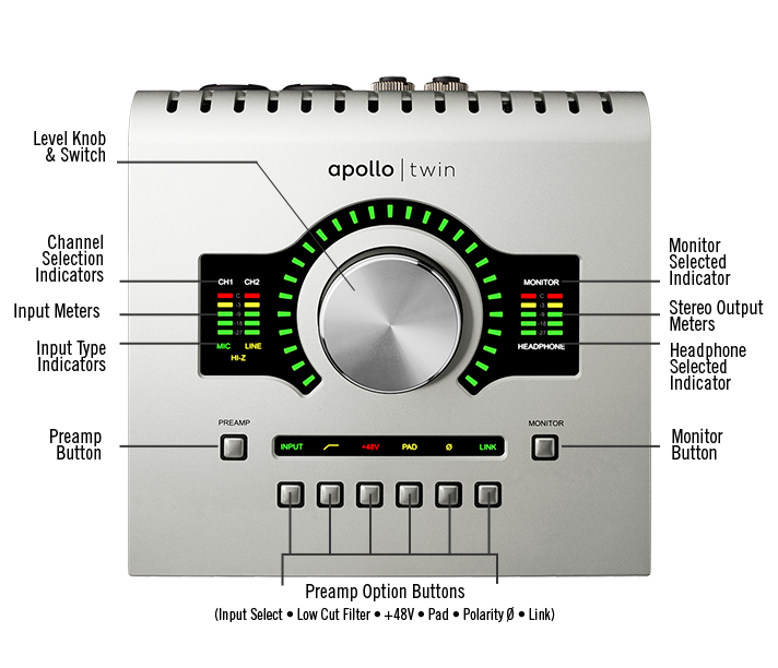 - 2 ngõ vào cho micro tích hợp tiền khuếch đại PGA2500 và DI cho nhạc cụ JFET như trong các Apollo cao cấp trước đó. Đặc biệt công nghệ mới Unison được sử trong Apollo Twin cho phép người sử dụng có được âm thanh của preamp LA-610 danh tiếng của hãng Universal Audio như một plugins tích hợp.